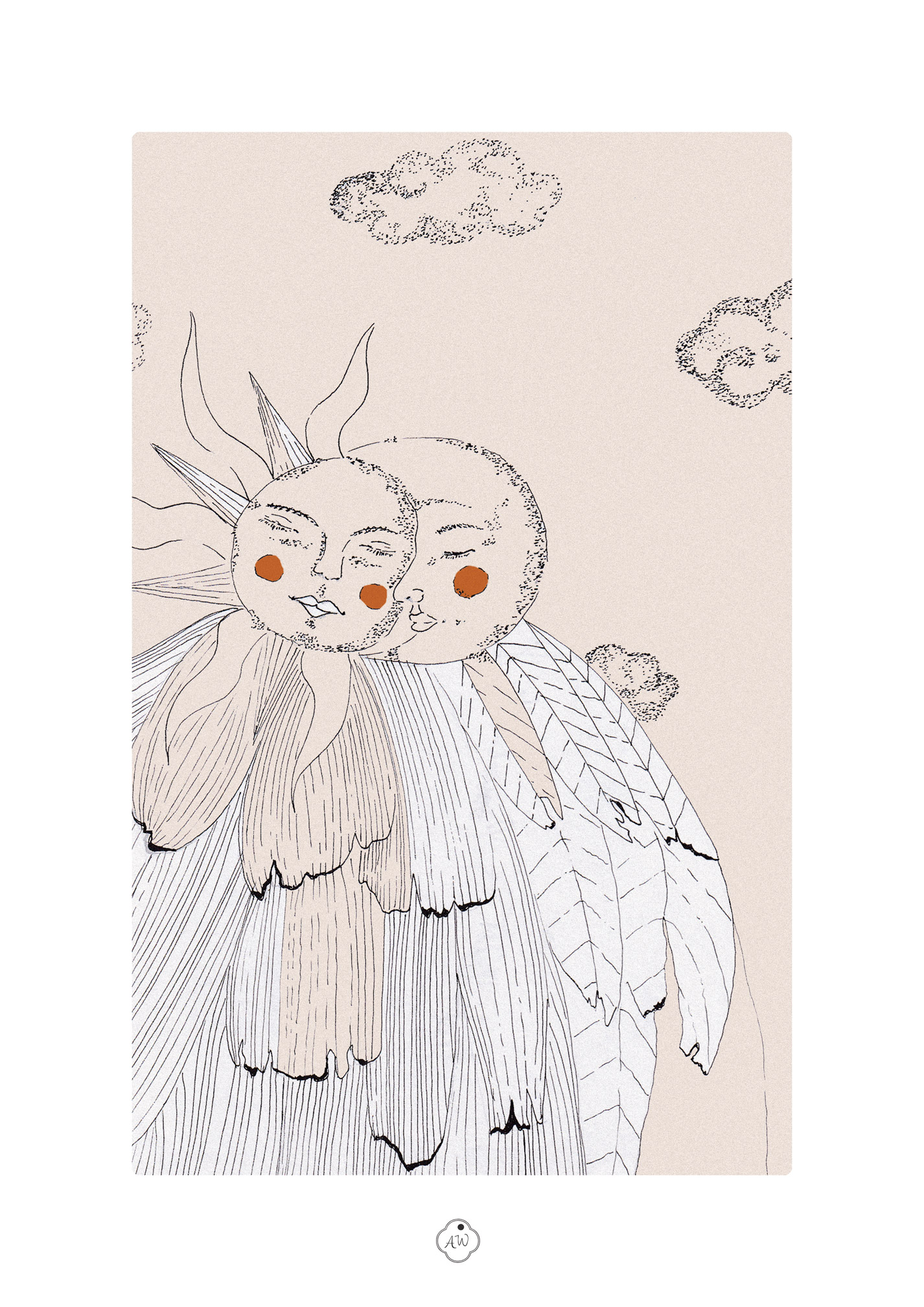 La lune me parle, le soleil me réchauffe le cœur. Ils nous rappellent que nous sommes toujours observés par la poésie du monde. J’ai rassemblé ces deux-là : Au clair de toi célèbre la rencontre fusionnelle entre l’astre du jour et celui de la nuit. Leurs visages apaisés, joue contre joue, nous rappellent que nos propres parts d’ombre et de lumière ne sont pas ennemies, mais les deux faces d’une même harmonie.