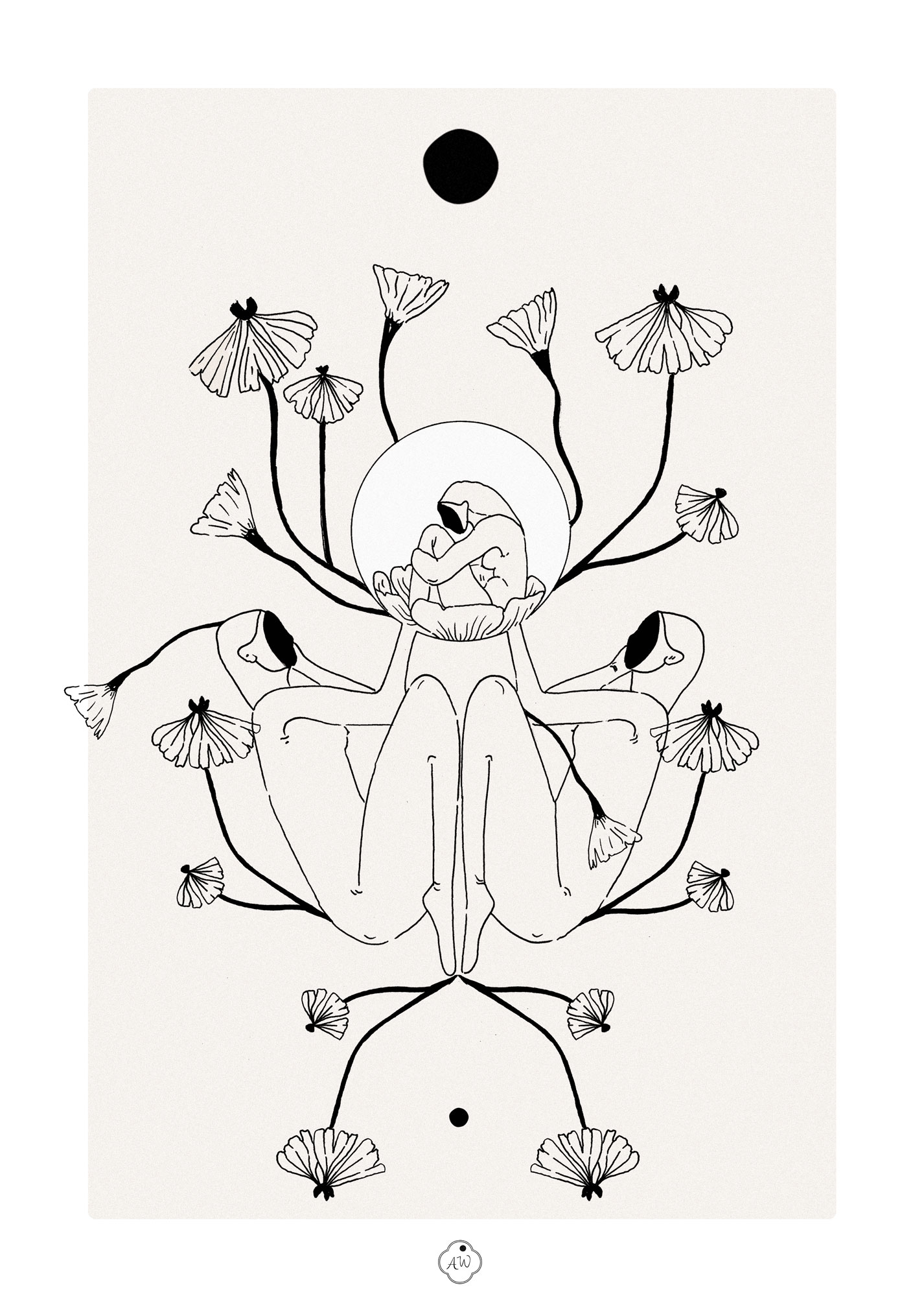 Dans cette version monochrome, j’ai voulu revenir à l’essence même du trait. Cette symétrie est notre force ; elle crée l’espace nécessaire pour que la bulle de vie puisse exister. C’est le point culminant de notre sororité : devenir, ensemble, le réceptacle de l’avenir.