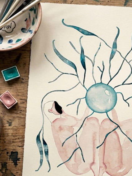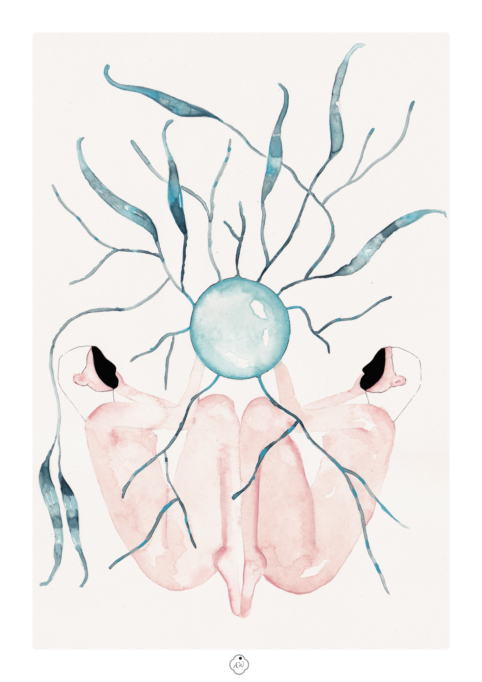 Deux figures féminines en symétrie parfaite, les corps s’effacent derrière la circulation des énergies. Cette symétrie exprime une sororité sans hiérarchie, où le flux de l’une nourrit l’autre. C’est une célébration de la vie qui persiste, une allégorie de l’espoir qui naît dès que l’on accepte de se relier.