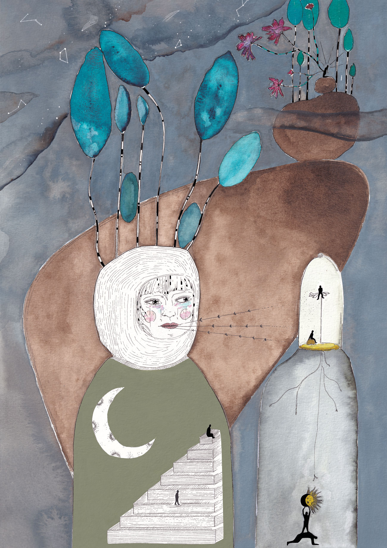 L’âme de l’illustration: L’hybride, figure centrale porteuse de secrets et d’énergie vitale, insuffle la vie à de nouveaux humains-miniatures, semblables à des graines d’un monde en gestation.