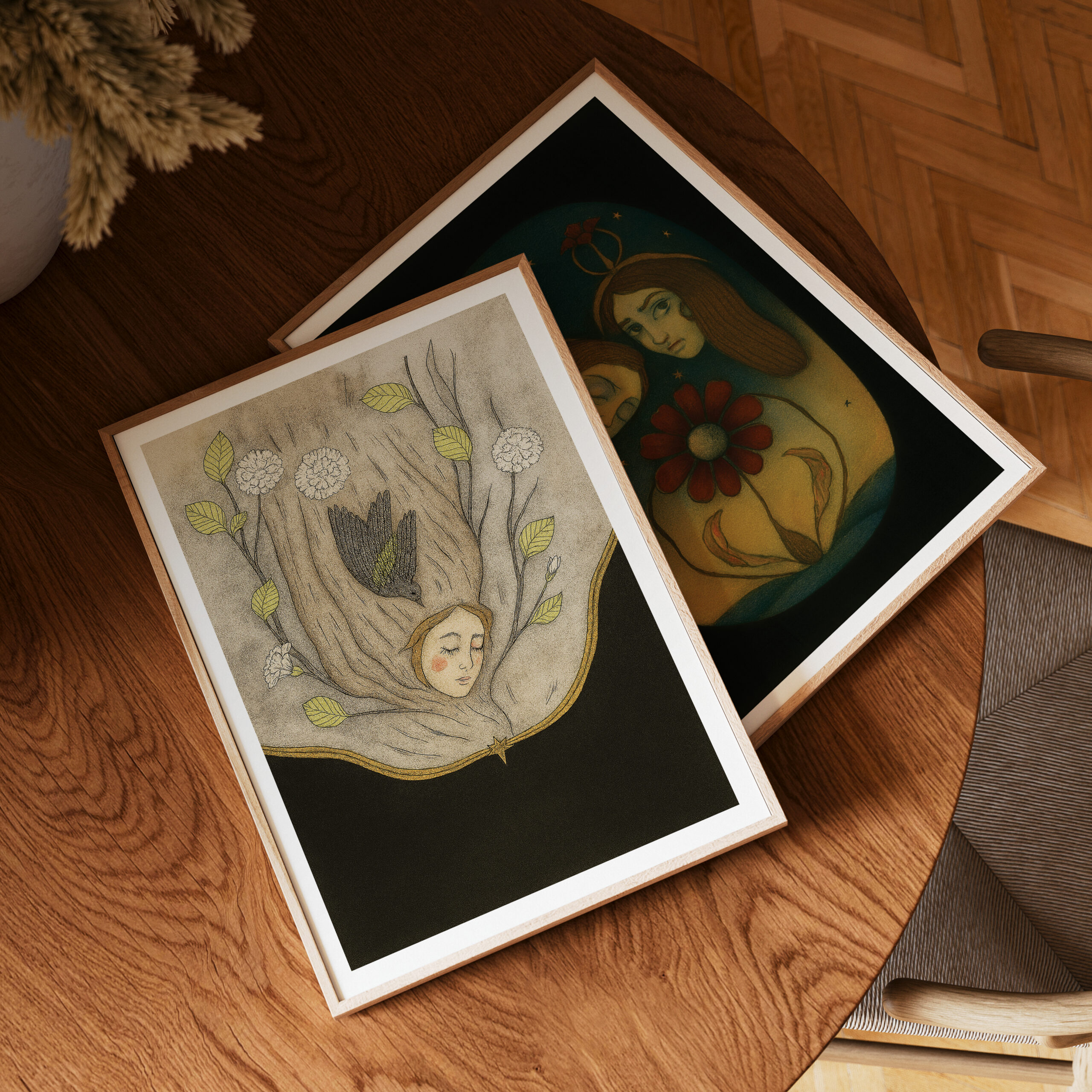 « La Muse » capture l’instant sacré du repos créateur. Le visage endormi, entouré d’une flore douce et d’un oiseau messager, symbolise l’état où l’âme s’ouvre sans effort à de nouvelles idées. Fidèle à ton esthétique, elle utilise le contraste sombre et lumineux pour rappeler que l’inspiration réside dans le contraste entre le monde extérieur et le calme profond.