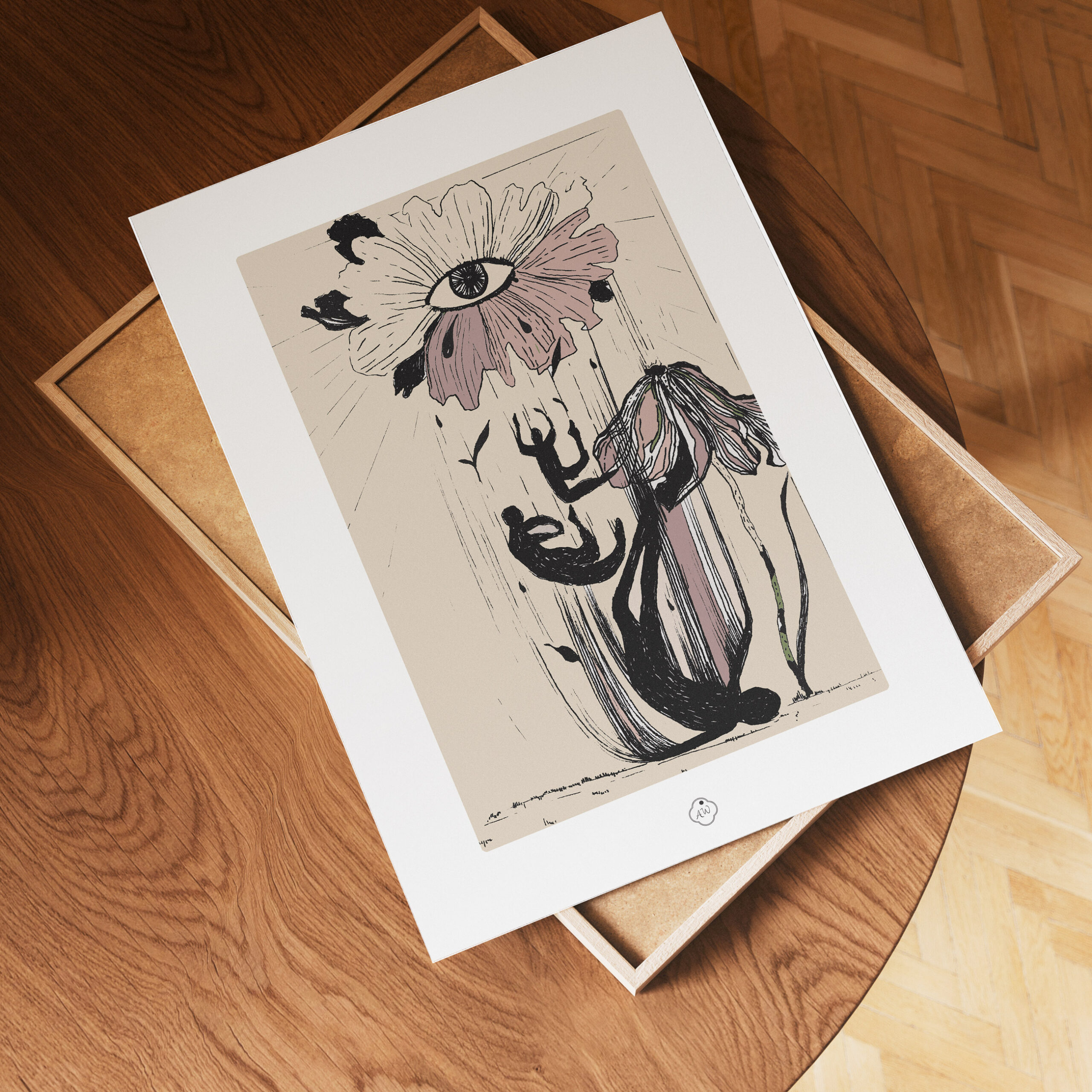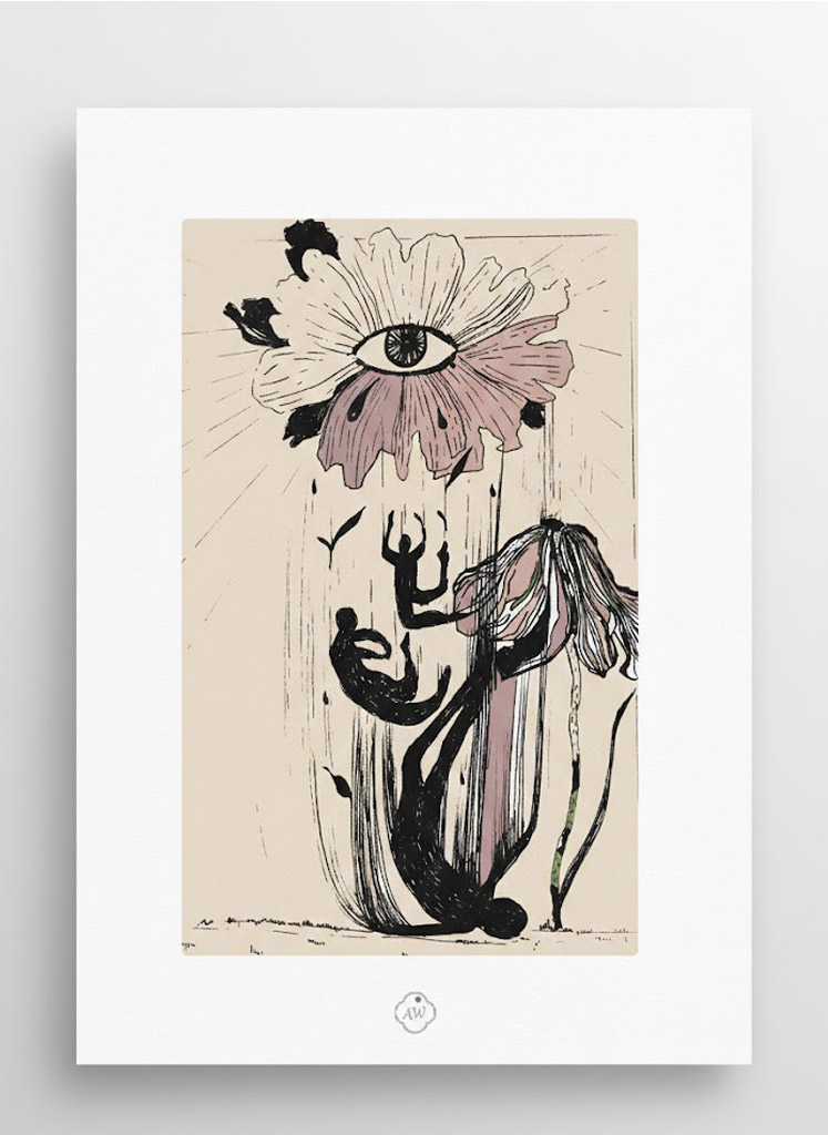 - La Symbolique de la Descente : Une composition onirique où chaque élément raconte le passage d’un état à un autre. L’Œil-Fleur, source de vision organique et spirituelle, veille sur la scène tandis que les silhouettes illustrent la chute comme le seul chemin vers un nouveau désir profond.